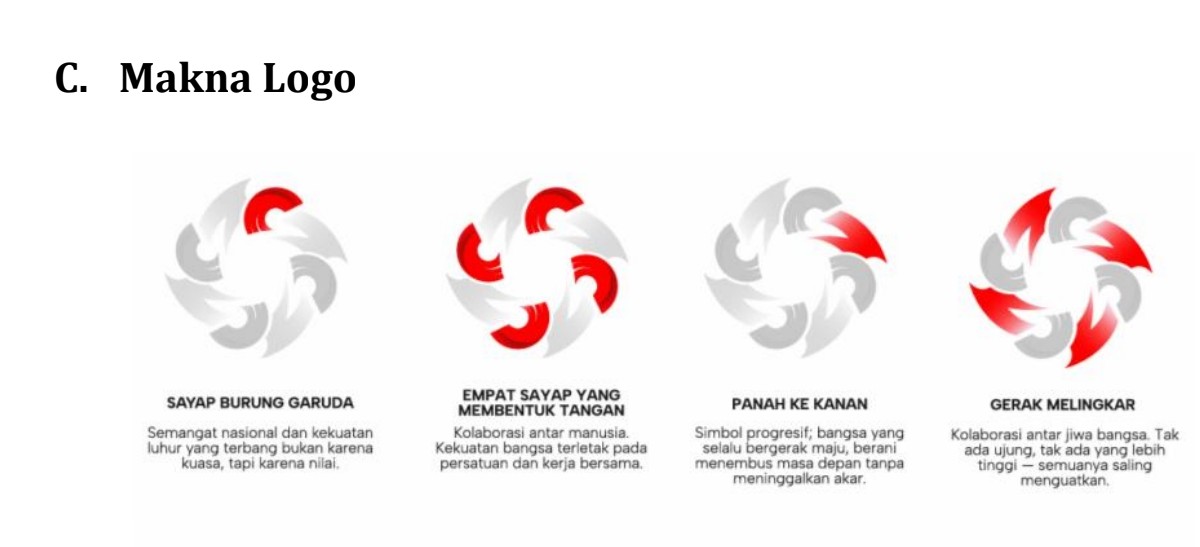 Logo berbentuk empat sayap yang membentuk tangan dengan arah panah ke kanan dan gerak melingkar, merepresentasikan progresi bangsa yang terus bergerak maju tanpa melupakan akar sejarah. Setiap elemen memiliki makna mendalam. Sayap burung garuda melambangkan semangat nasional dan kekuatan luhur bangsa; empat sayap menandakan kolaborasi antar manusia yang menjadi kekuatan dalam kerja bersama; panah ke kanan menjadi simbol keberanian untuk menembus masa depan; sementara gerak melingkar mencerminkan persatuan jiwa bangsa yang saling menguatkan.